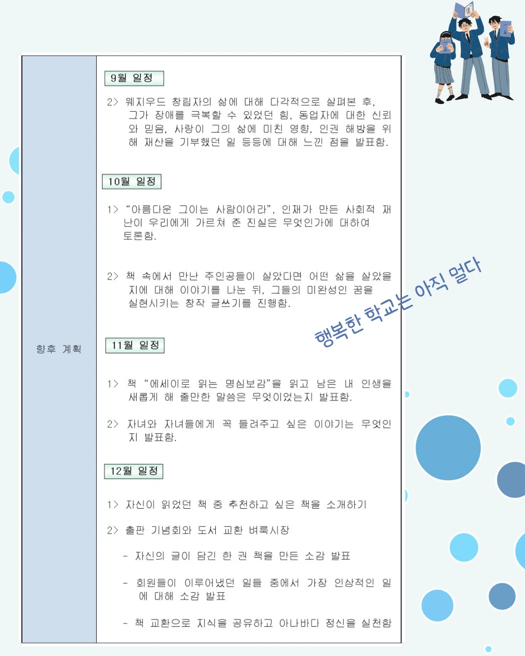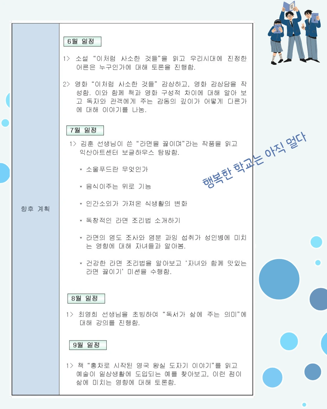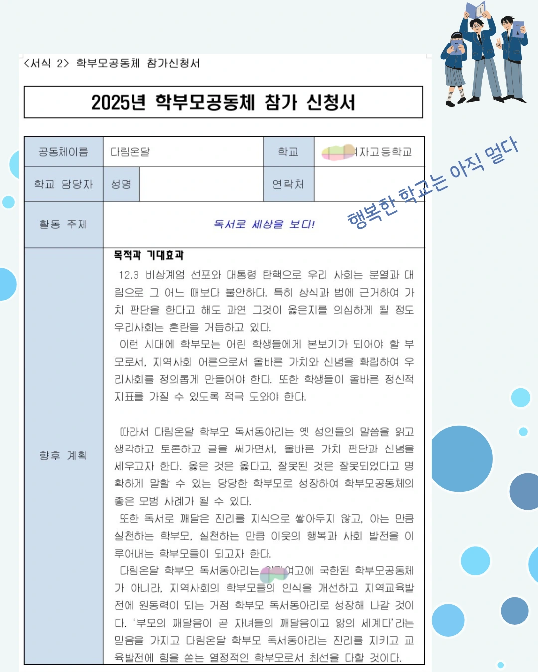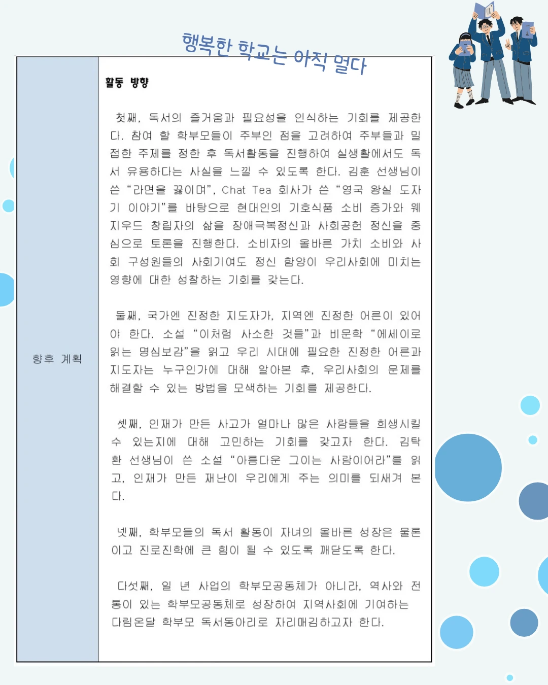 아래 사진은 학부모공동체 활동 계획서로 학교에 제출한 서류이다. 이 내용으로 학부모공동체가 활동이 이루어졌다면, 어떤 효과가 있었을까