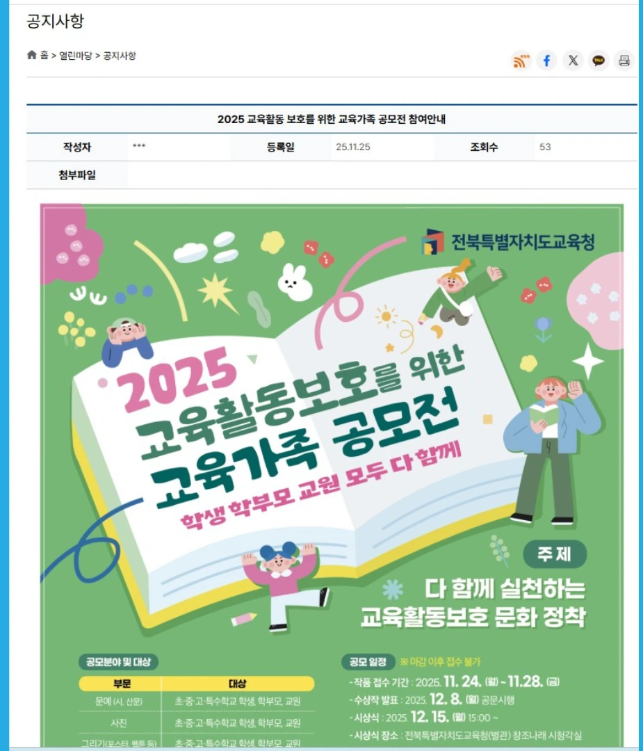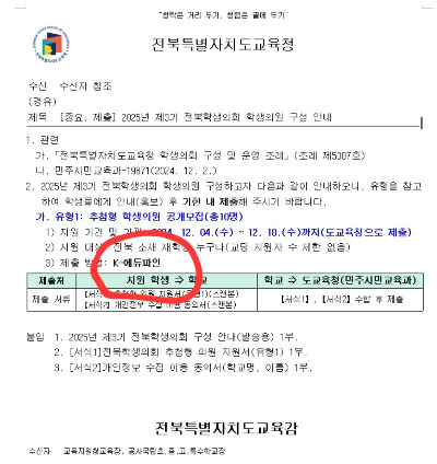 다음은 제3기 전북학생의회 학생의원 구성 공문도 홈페이지에 이 사진 파일 한 장이 전부였다. 또한 신청기간이 12월 4일에서 18일인데 공지된 날짜는 12월 9일이다. k-에듀파인 제출방식을 보고도 학생에게 접수하라고 집에 보냈고, 그로 인해 접수 차질이 벌어졌다. 결국 다음날 아침 일찍 도교육청과 의논한 끝에, 아침에 접수를 완료시켰다. 이로 인해서 12.3 계엄 선포에 충격을 받고 시민들의 참여정신이 대단히 중요하다고 깨달은 학생이 전북학생의원에 지원하고자 노력했지만, 학교 측의 공고와 업무행정시스템 이해 부족으로 접수에 어려움에 직면했다. 이것 역시 학교 측의 의도가 강하게 깔려 있다는 생각이 든다. 하지만, 이런 학생들의 참여가 절대적으로 필요하다는 타학교 교사들의 도움과 응원 덕분에 접수는 성공했다.