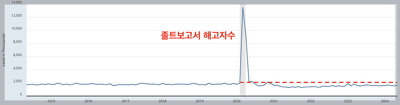 다음 확인할 건 '해고자수'인데요, 이번 해고자수는 165만 4천 건으로, 전월대비 11만 2천 건 증가했습니다. 이는 굉장히 안정적인 수준인데요. 위 그래프를 봐도 아시겠지만 현재 해고자수는 코로나 직전 보다 낮은 수준입니다.
