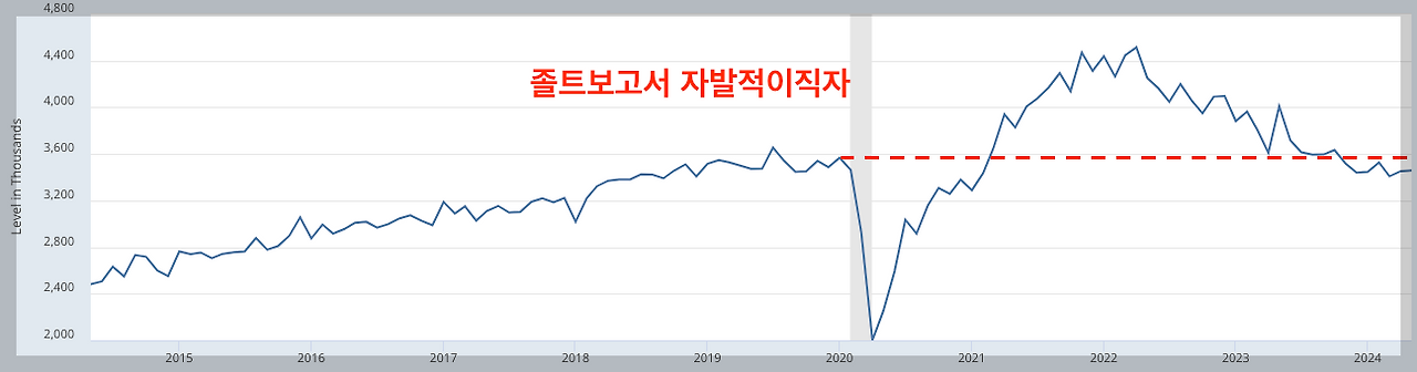 자발적이직자의 증가는 더 좋은 회사가 있어 말그대로 스스로 이직 결정을 한 사람들을 뜻하는데요. 이는 고용시장에서 긍정적으로 해석합니다. 즉 최근 3개월 동안의 자발적이직자 증가는 더 좋은 회사가 있다는 긍정적 신호로 볼 수는 있지만, 현재 수준은 코로나 이전보다 낮은 수준이란 점이고, 3개월 증가를 해도 코로나 이전보다 낮은 수준입니다. 그리고 무엇보다 꾸준히 하락하는 추세를 보이고 있죠.