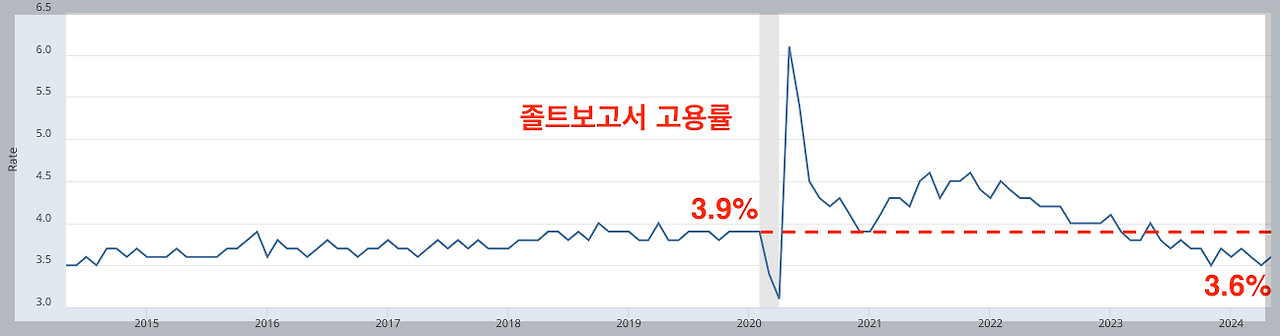 이에 따라 현재 고용률은 계속해서 하락하는 중이고, 현재 3.6% 수준으로 코로나 직전 3.9% 보다 낮은 고용률을 보이고 있습니다.