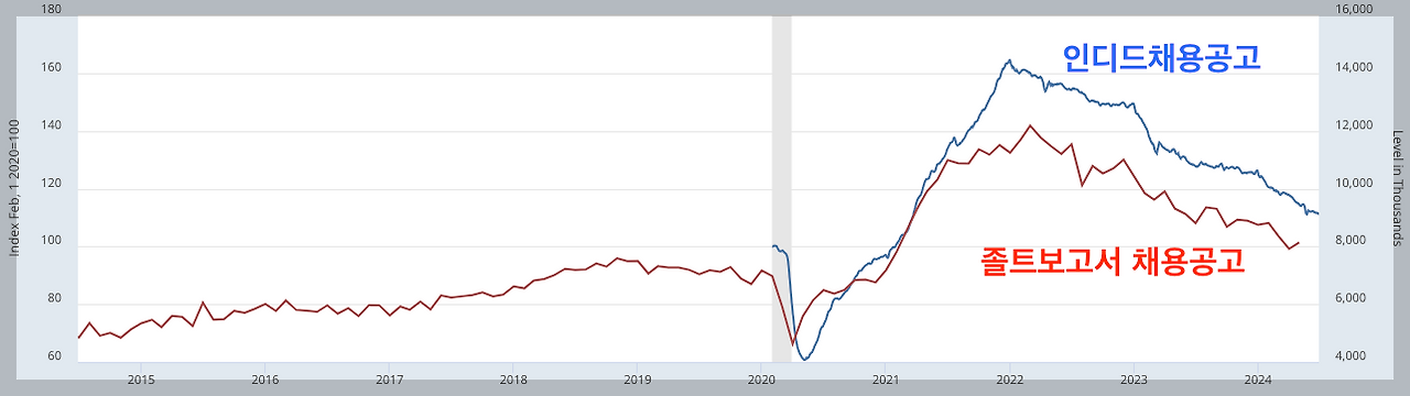 다시 한번 반복하는 얘기지만, 현재 채용공고는 높게 나오는 수준이지만 실질적인 고용으로 이루어지고 있진 않다는 걸 확인할 수 있습니다.