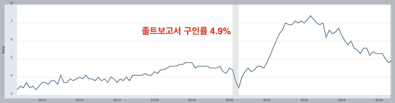 마지막으로, 두 번째로 중요한 '구인률'인데요. 이번 구인률은 4.9% 수준으로, 지난 크리스토퍼 월러 이사가 제시한 4.5% 수준과는 아직 간격이 있는 상태입니다. 직전달에는 4.8%가 나왔는데, 되려 월러이사의 기준치 보다 좀 더 멀어졌습니다.