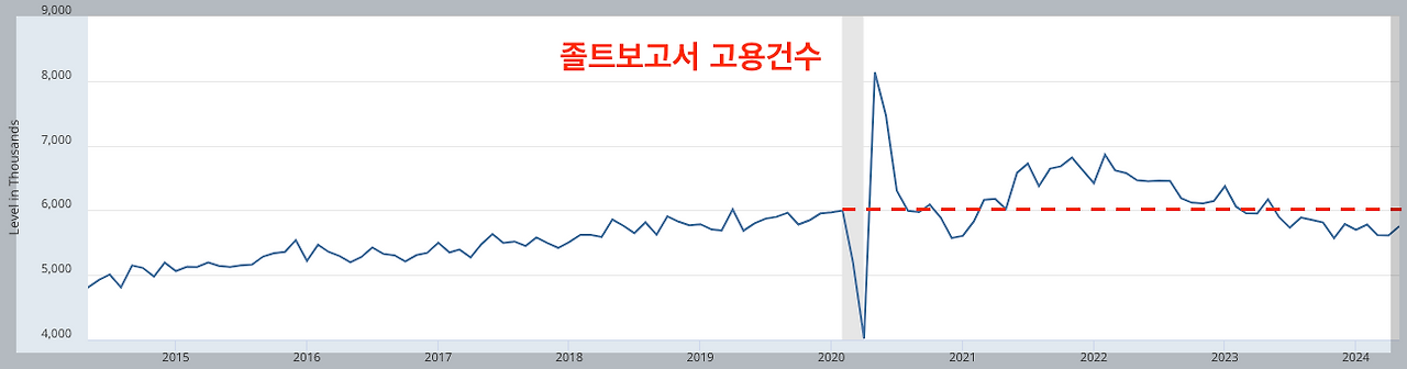 5월 미국 졸트보고서 발표치는 814만 건으로, 전월대비 221,000건 증가했습니다. 그리고 시장전문가들의 예측치도 상회하는 수준으로 발표되었습니다.