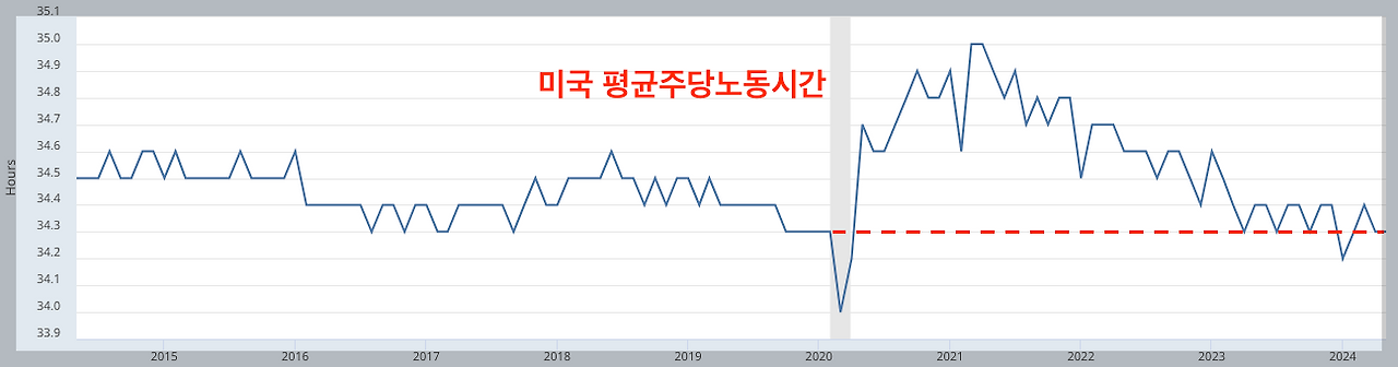 또한, 현재 미국 기업들은 고용을 늘리고 있지는 않지만 그렇다고 해고를 늘리고 있지도 않다 했는데요. 하지만 주당노동시간을 계속해서 감축하고 있고, 현재 코로나 이전과 동일한 시간을 보이고 있습니다.