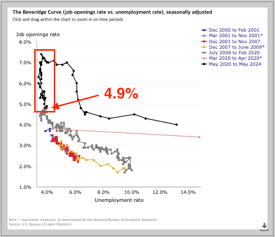 밴버냉키는 구인배율이 1.2배 수준일 경우 인플레이션이 2.8% 수준을 기록할 거라 말한 적이 있고, 지난 파월 연준의장은 인플레이션이 3% 아래로 하락할 경우 금리인하 가능성이 있다 말한 적도 있는데요.