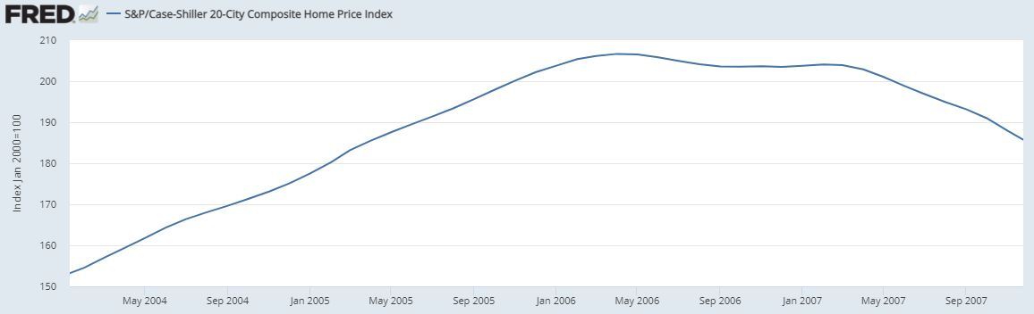 대출금리가 오르면서 서브프라임 등급의 채권자들은 높아진 이자를 감당할 수 없게 되었고, 드디어 부동산이 점차 하락하기 시작했습니다. 이때가 [서브프라임 모기지 사태]의 시작입니다.