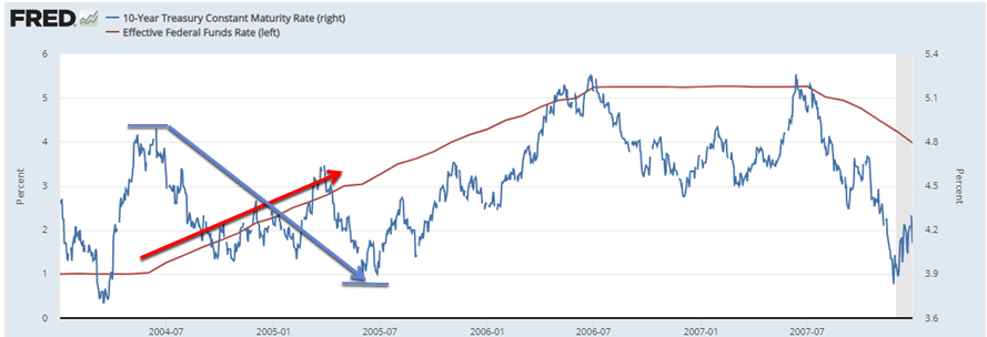 커져가는 버블을 잡기 위해 당시 연준의장이었던 그린스펀은 기준금리를 올리기 시작했습니다. 하지만 이상하게 기준금리를 올려도 장기금리가 오르지 않고, 오히려 하락하는 상황이 만들어졌습니다. 이에 따라 장기금리와 연동되는 모기지금리가 오르지 않고 계속 하락하여 부동산 거품이 끊이지 않게 상승하게 되었죠.