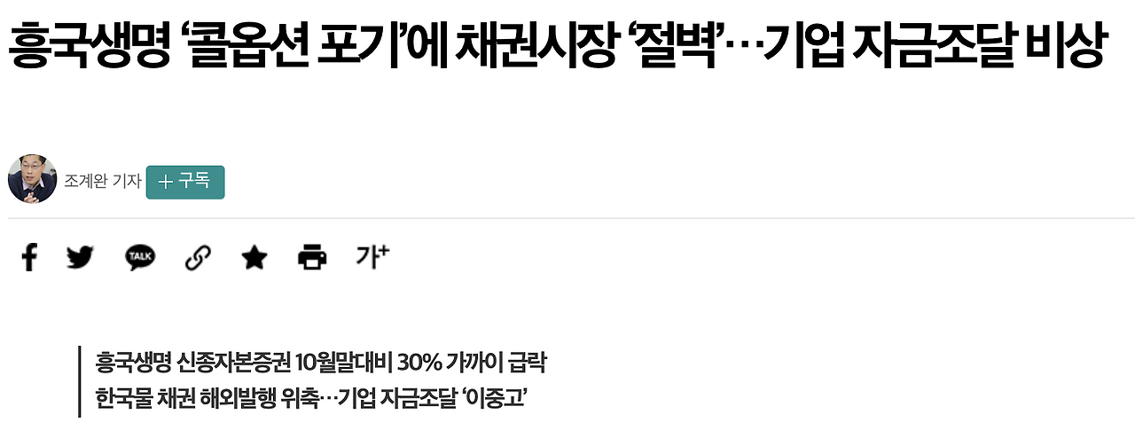 2022년 하반기 무렵, 흥국생명의 콜옵션 포기 사태가 있었습니다. 이는 콜옵션 시기때 원리금을 상환해주지 않고, 상환 시기를 다음 차로 미루겠다는 뜻이죠. 당시 흥국생명의 채권가격이 급락했던 적이 있었으며, 이에 따라 큰 문제가 발생할 뻔 했습니다. 어쩌면 흥국생명 자체가 부도가 날 수 있었죠.