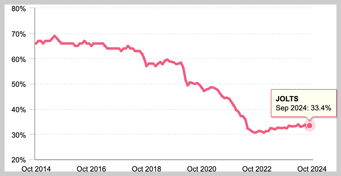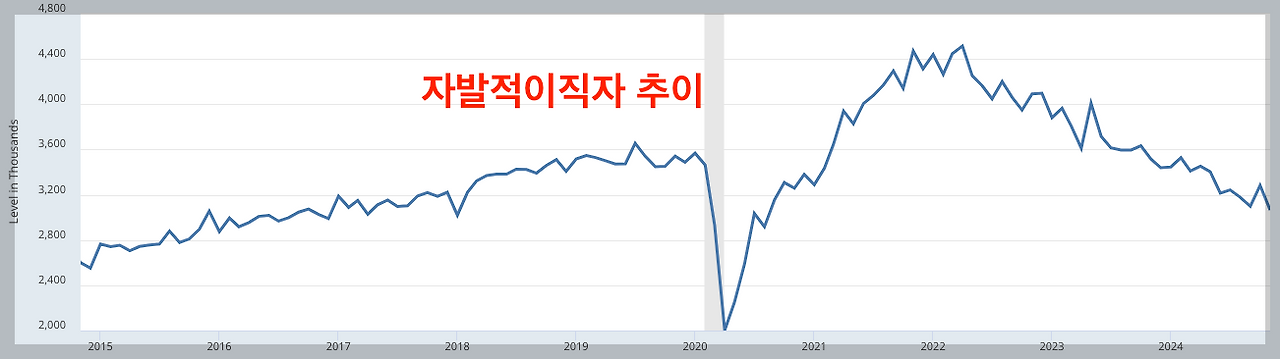 위 그래프를 보면 아시겠지만, 현재 자발적이직자는 계속 감소하는 추시이며 코로나 전보다 더 낮은 상태를 보여줍니다.