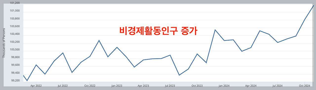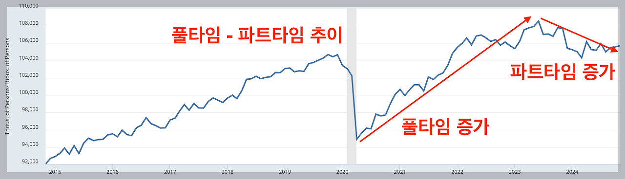 최근 비경제활동인구가 빠르게 증가하는 중인데요. 다시 말해 노동시장을 이탈하는 사람들이 증가하고 있기 때문에 파트타임의 추가 증가가 잘 나타나지 않는 거예요. 만약 파트타임에서 추가 감소가 없다면, 풀타임의 증가로 이어지지 않았을까요?