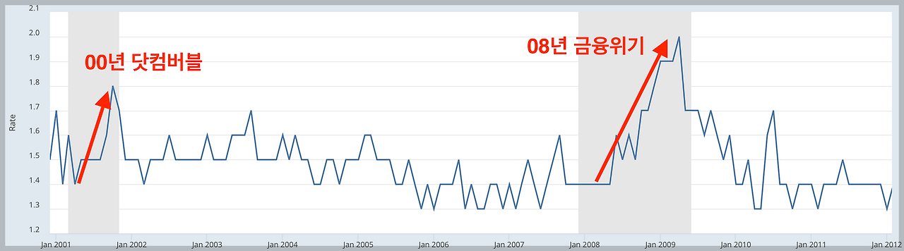 다만, 해고율의 경우는 고용지표 중 가장 후행하는 지표이기 때문에 경기침체가 발생되는 시기에 증가하는 모습을 보입니다.