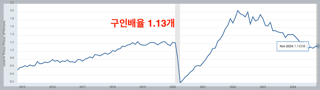 구인배율은 1인당 일자리 개수를 뜻하는데요. 다시 말해 1명당 1.13개 정도의 일자리는 있다는 겁니다. 이렇게 나오기 때문에 미국 고용시장이 좋다는 이야기가 많은 거예요.