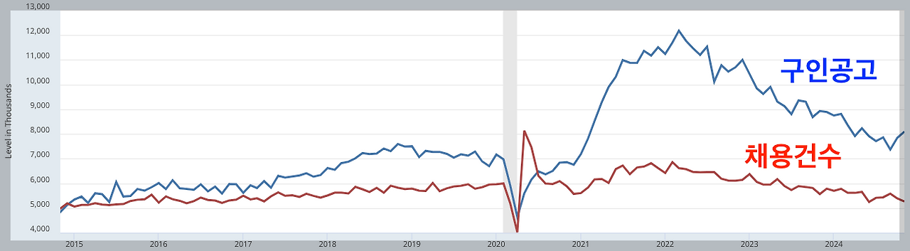 위 그래프를 보면, 졸트보고서의 구인공고 건수와 채용건수의 추이를 보여줍니다. 코로나 이후 두 지표의 차이는 극심하게 나타나기 시작했는데요.