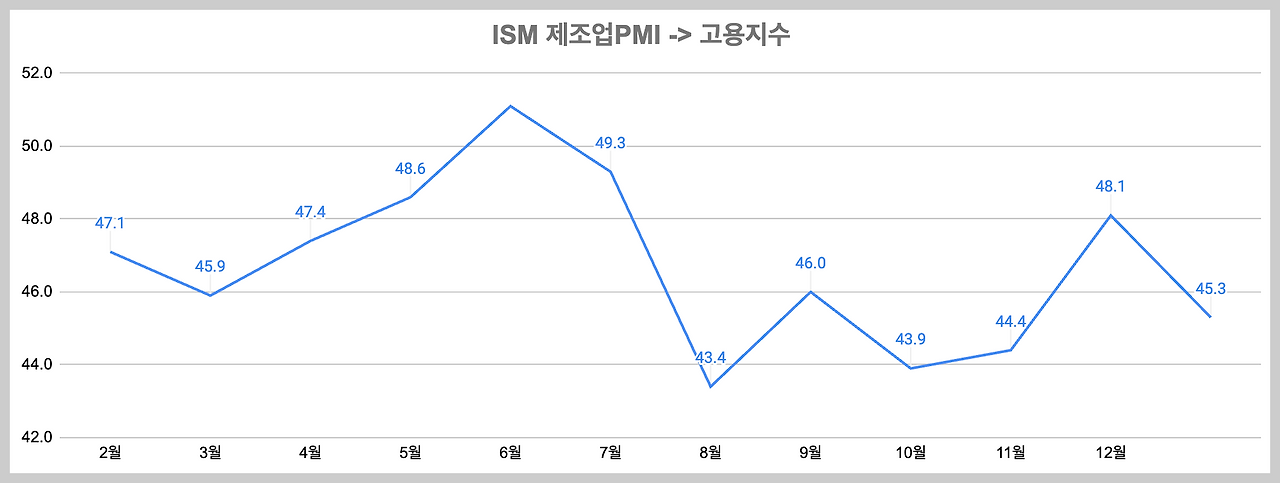 또한, 최근 발표된 12월 ISM 제조업 및 서비스업 PMI 지표 중 고용 부문을 보면, 제조업 고용 추이를 보면 회복하는 모습이 나타나진 않고 있으며, 특히 12월 고용이 급격히 하락하기도 했습니다. 서비스 고용의 경우 고용이 소폭 하락하는 모습을 보였죠.