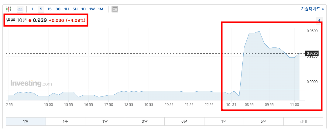 그에 따라 일본 10년 장기금리는 0.8% 중후반대에서 0.93%로 대략 4%가 넘는 상승을 했습니다.