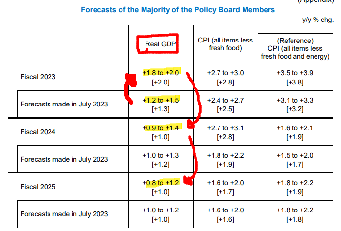 보시는 것처럼 일본은행은 지난 번 회의에서 23년 일본의 GDP성장률을 1.5%로 전망했습니다. 하지만 이번에 2%로 상향 조정을 했죠. 즉 올해 일본의 경제성장률은 좋다는 뜻인데요. 이는 충분히 긍정적인 면일 수 있습니다. 그래서 여기까지만 보면 오히려 엔화강세로 이어지는 게 당연한 일이죠.