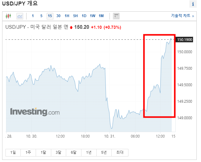 하지만 생각과 다르게 엔화는 약세를 보였고, 금리 발표전 149엔을 보였던 환율은 다시 150엔을 넘어섰습니다.