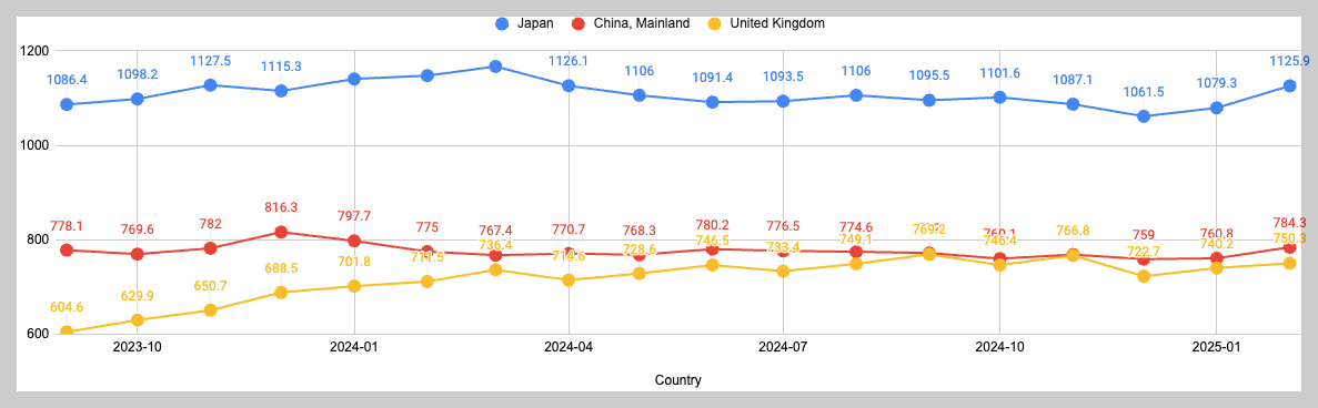 미국채 수요를 살펴보면, 최신 자료 2월 해외국가 미국채 보유량은 여전히 높고 계속해서 증가하는 중입니다. 24년 9월 이후 소폭 감소하긴 했지만, 이는 일본의 엔화약세 방어를 위한 미국채 매도로 발생된 현황이고, 25년 2월을 보면 24년 9월 고점을 뚫고 상승한 상태입니다.