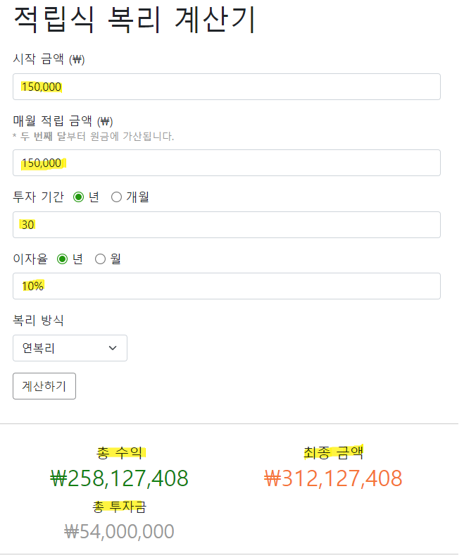 연평균 수익률 10% 가정으로 매월 15만 원씩 30년 납입을 하게 될 경우 얻을 수 있는 금액은 3억이 넘습니다. 투자금액은 5,400만 원 뿐이지만 약 5배가 넘는 돈을 얻을 수가 있죠.