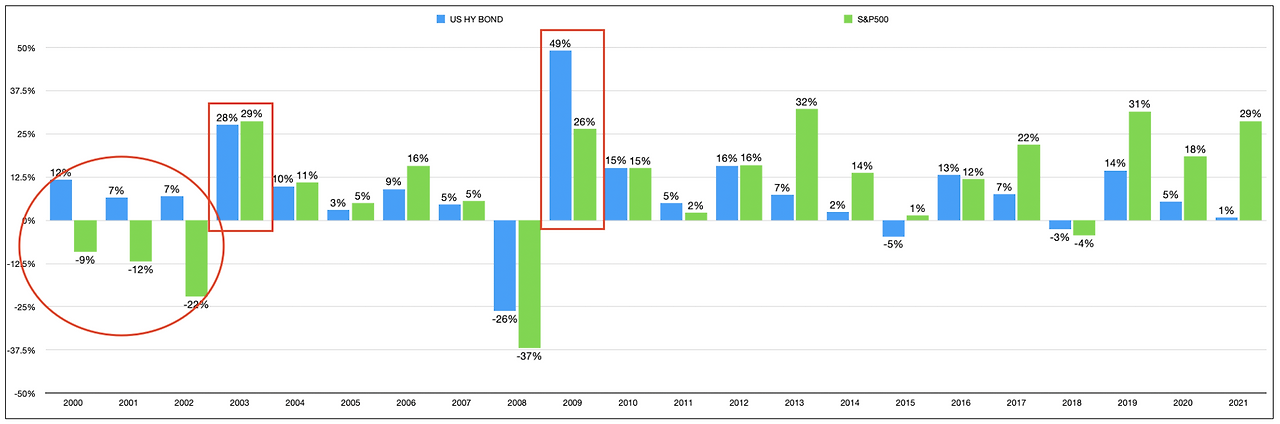 하이일드채권은 고위험채권이지만 그럼에도 주식보다 안전할 때도 있습니다. 2000년 초반 시기, 동그라미친 부분을 보면 2000년 닷컴버블과 911테러, 미&이라크 전쟁이 있었던 경기악화 시기때였지만 주식은 크게 하락한 반면 고위험회사채는 오히려 수익이 난 시기입니다.
