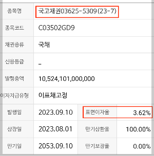 현재 장내채권 시장에서 거래가 이루어지고 있는 국채 하나를 가지고 왔는데요. 20년 만기 장기채권입니다. 표면이자율을 보면 3.62%의 금리를 제공해주는데요, 이는 즉 매년 3.62%의 이자를 확정적으로 받을 수 있다는 뜻이 됩니다.