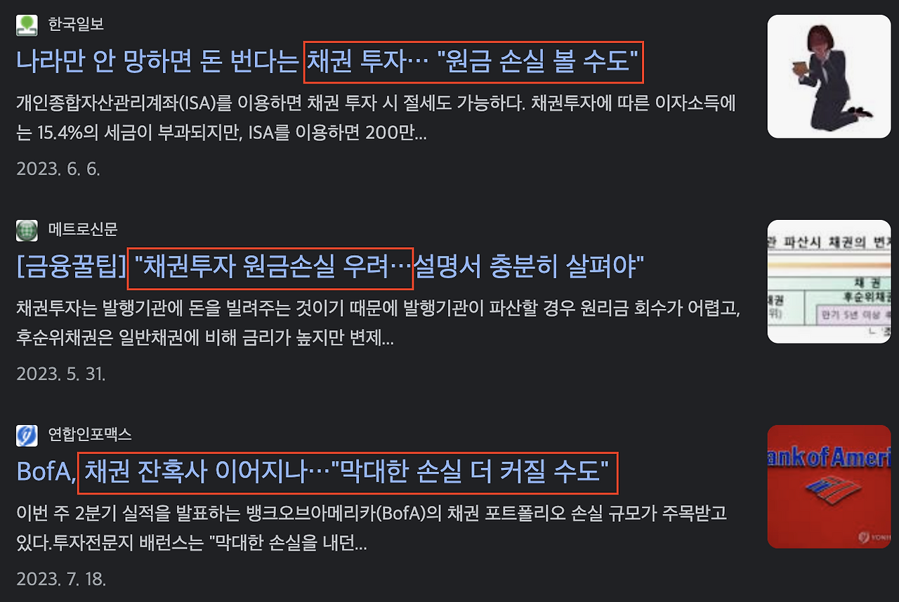 그런데 이런 기사가 있죠. 작년부터 올해 상반기, 하반기 초반까지만 해도 채권으로 원금손실 발생 가능성이 존재한다는 기사와 이야기가 엄청 많이 돌았습니다.