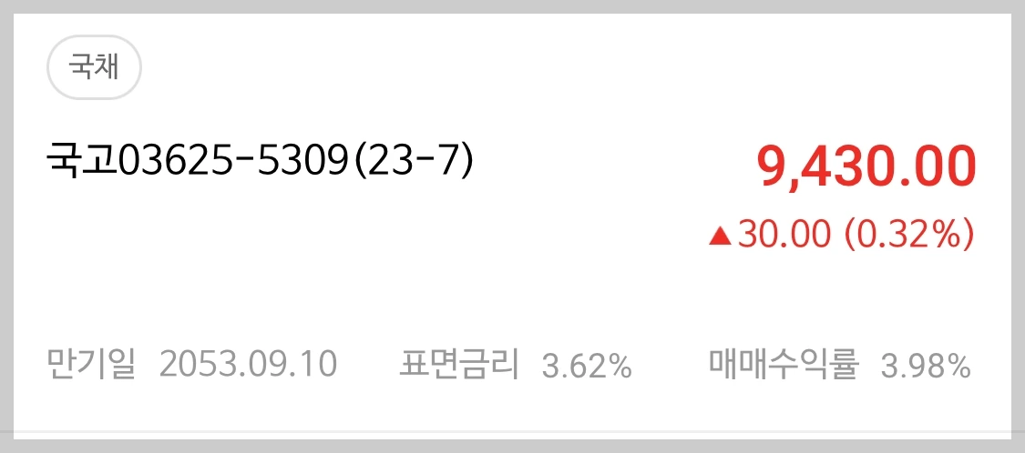 현재 이 채권의 매매수익률은 무려 3.98%가 됩니다. 다시 말해 이 채권을 매수하게 된다면 내가 얻는 수익률은 약 4% 가까이 된다는 뜻이죠. 굉장히 높은 수익률까지 얻을 수 있는 거죠.