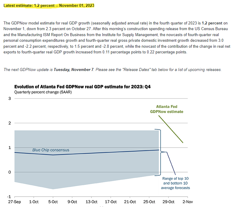 실제로 미국의 4분기 예상 GDP성장률은 1.2%로 측정이 되고 있습니다. 3분기 GDP성장률이 4.9%로 나온 것에 비하면 굉장히 크게 하락한 걸 확인할 수 있죠.