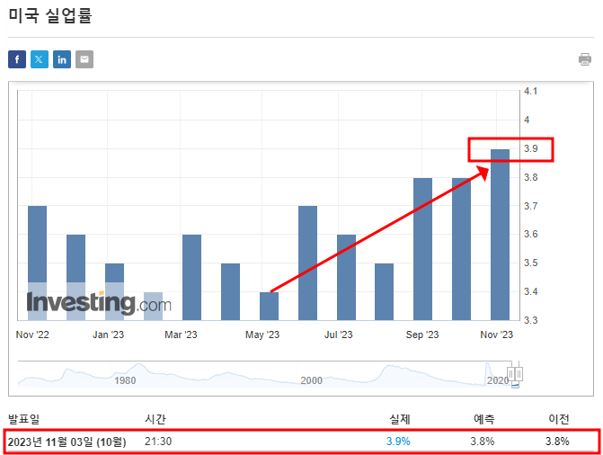 11월 3일, 미국의 실업률이 발표됐습니다. 미국의 실업률은 3.9%를 보이고 있고, 이전치 및 예측치를 상회하는 수치가 나왔습니다. 최근 미국의 실업률이 점차 상승하는 모습을 보이고 있지만 일각에서는 이런 이야기를 하기도 합니다.