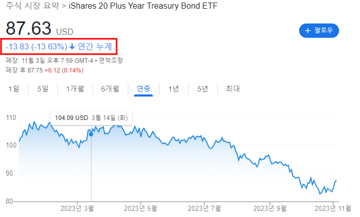 올해 미국의 금리가 5%대까지 오르면서 미국 20년물 국채가격은 굉장히 많이 하락했는데요, 현재 기준 미국의 20년 국채가격은 약 -13% 이상 하락한 상태입니다. 다른 말로 바꾸면 13%정도나 할인이 된 상태이고, 굉장히 저렴하다는 뜻이겠죠.