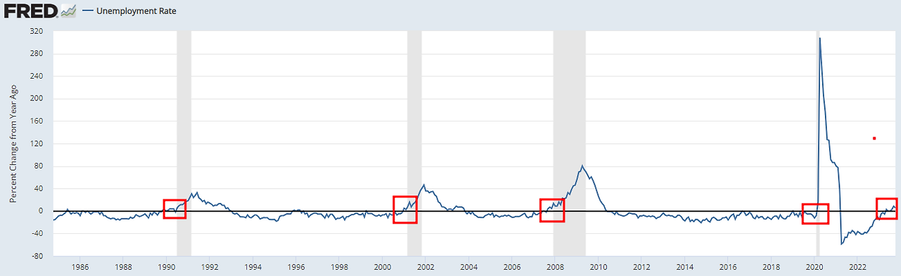 위 표를 보시는 것처럼 현재도 전년대비 실업 증감률이 '0' 위로 올라선 상태입니다. 이 말은 곧 머지 않아 경기침체가 발생할 확률이 높다는 뜻이 되겠죠. 실업률이 증가하는 속도가 과거 경기침체 당시와 비슷한 수준이라는 뜻이니까요.