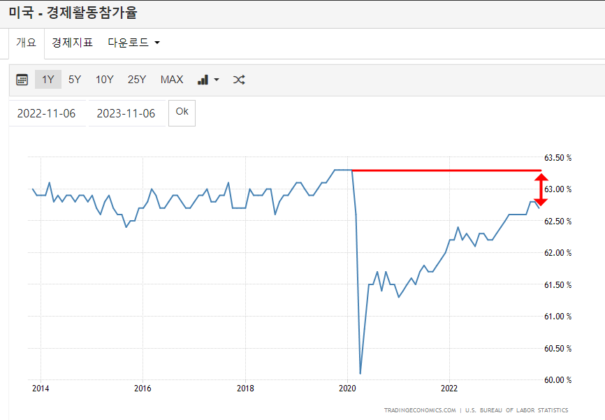 11월 3일 발표된 미국의 경제활동참가율은 62.7%로 이전치 및 예측치보다 낮은 수치로 발표가 됐습니다. 본래 느리지만 천천히 증가하고 있던 상태였는데, 이번에는 소폭 감소했는데요. 일단 좀 더 장기적인 그래프를 통해 확인해보겠습니다.