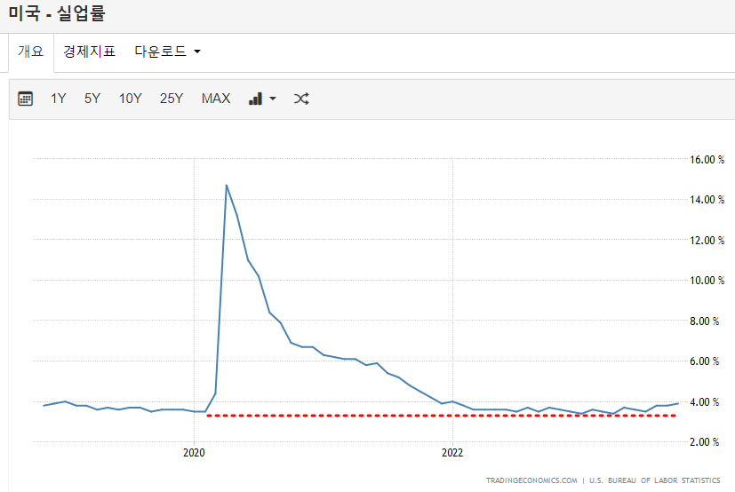 일단 자연실업률이란, 아무리 경기부양책을 펼치고 경기가 좋아도 일하지 않는 사람은 존재한다는 뜻입니다. 보통 자연실업률은 4% 이하로 잡는데요, 다시 말해 실업률이 4% 이하로 측정이 된다면 미국은 모든 국민이 대부분 일을 하고 있는 것과 같다고 해석할 수가 있습니다.