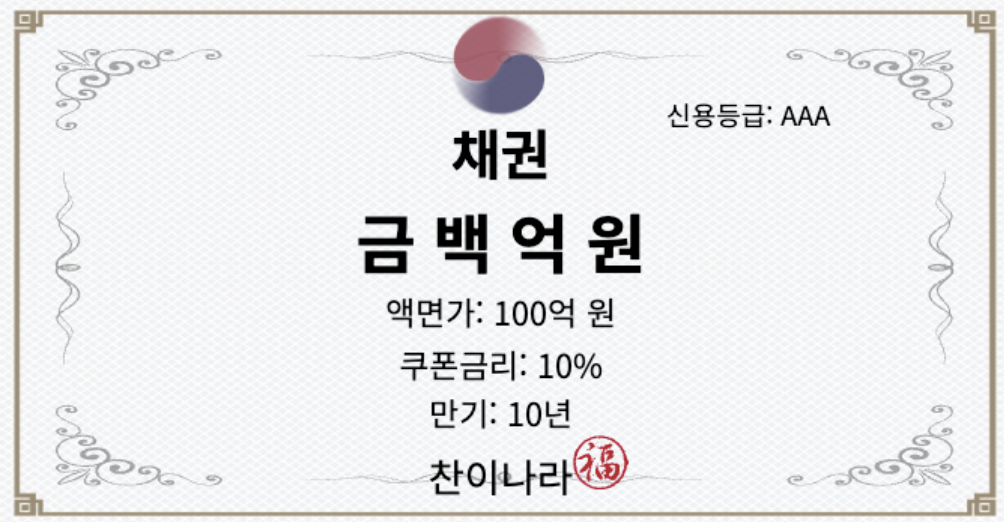항상 보는 채권이죠, 필자가 대통령으로 있는 찬이나라 채권입니다.