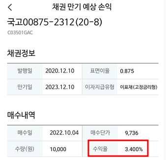 그리고 밑에를 보면 [수익률]이 적혀 있는데요, 본래 위 국채는 액면가 1만 원입니다. 하지만 '매수단가(채권가격)'을 보시면 9,700원으로 적혀 있죠. 즉 이 채권을 9,700원에 매입하면 만기가 될 때 이자와 액면가를 받을 수 있기 때문에 총 3.4%의 수익률을 얻을 수 있다는 뜻이 됩니다.