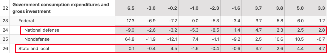 정부지출 부문의 세부항목을 살펴보면 연방, 국방, 비국방, 주/지방 이렇게 나뉘어 있는데요, 이 중에서 연방과 비국방 지출 부문은 하락하고 국방과 주/지방 지출만 증가한 것을 확인할 수 있습니다.