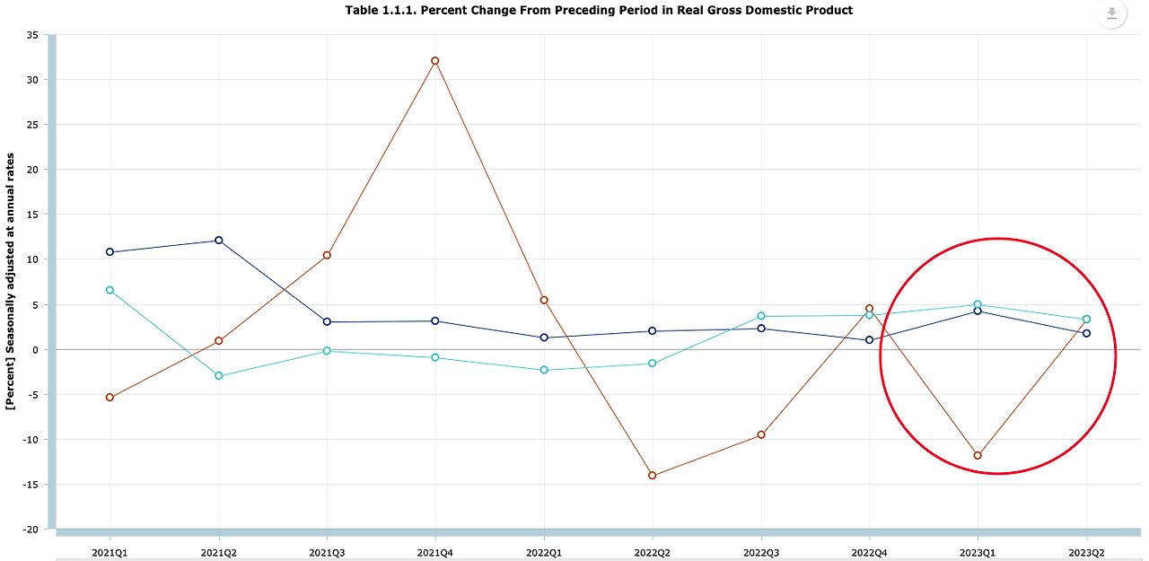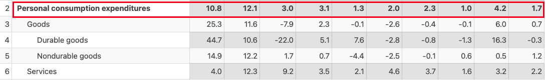 근데 안타깝게도 미국의 개인소비지출은 전분기 4.2% 대비 1.7%로 대폭 감소한 걸 확인할 수 있습니다. 즉 미국의 소비가 감소한 만큼 미국 GDP 성장률도 하락할 수밖에 없는 현상이 만들어지는 것이죠.