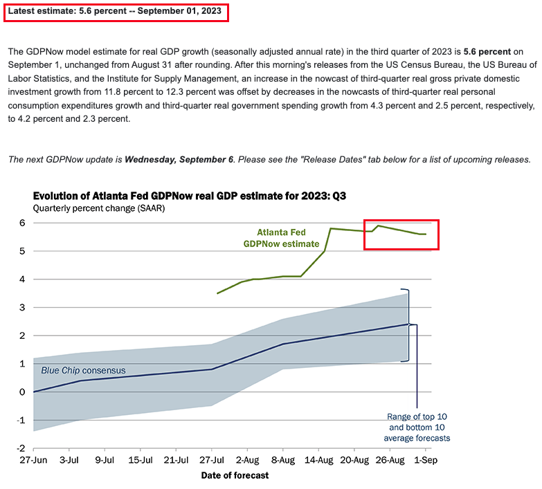 그리고 애틀랜타 연은에서 발표하는 미국의 GDPnow를 보면, 본래 5.9% 예상을 보였지만 이번에 5.6%로 전망치를 0.3% p나 감소시켰습니다.