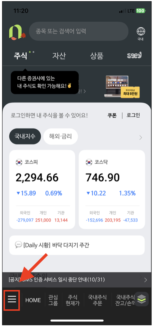 NH나무증권 어플로 접속하면 왼쪽 하단 화살표 표시된 곳을 눌러줍니다.