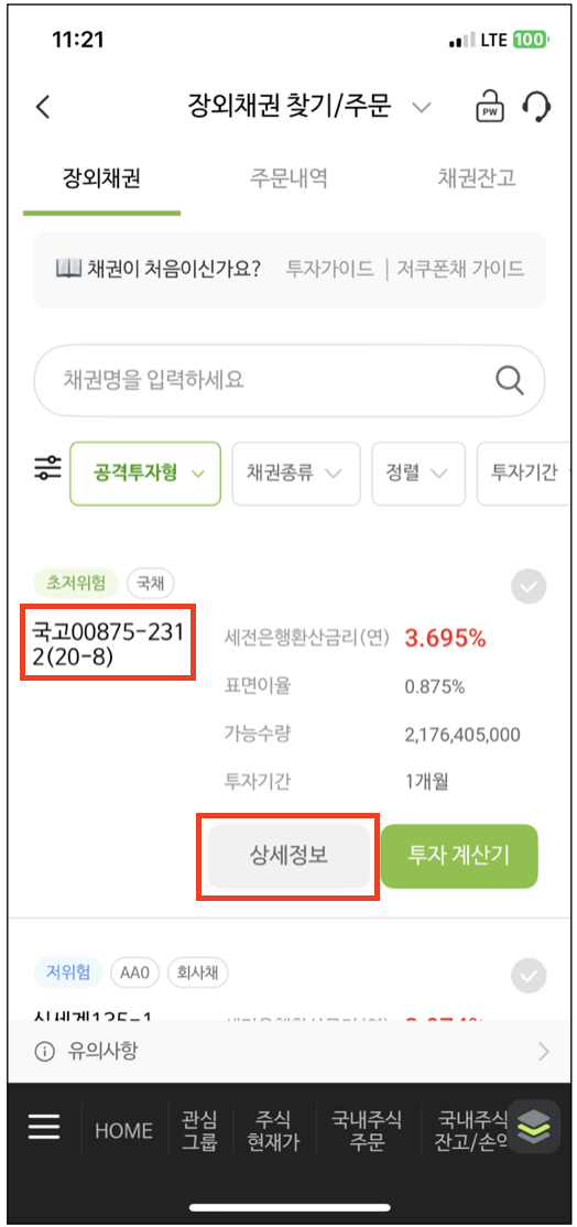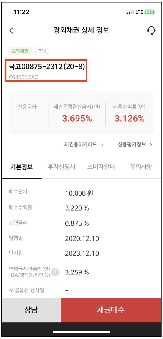 위 사진을 보면 [국고00875-2312(20-8)]이라고 쓰여 있는 채권이 하나 있습니다. 그 채권을 누르면 위와 같이 [상세정보]를 볼 수 있는 칸이 나오는데요, 상세정보를 눌러줍니다.