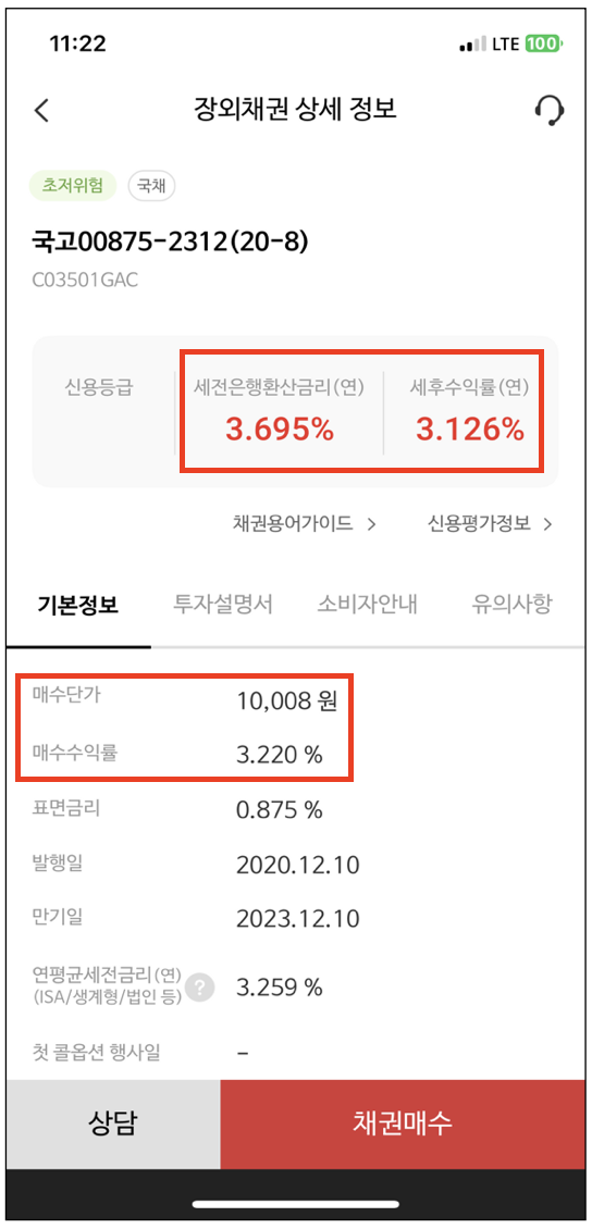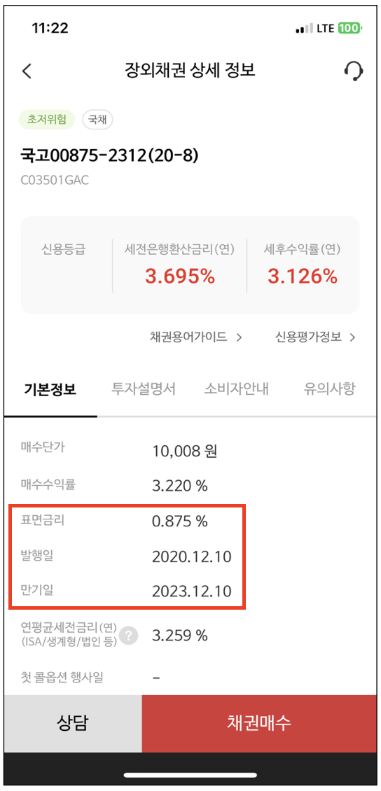총정리하면, [국고00875-2312(20-8)] 채권의 경우 20년도에 발행됐고 만기일은 23년 12월, 이 채권에 투자하게 될 경우 0.875%의 이자를 받게 됩니다. 이렇게 정리할 수 있습니다.