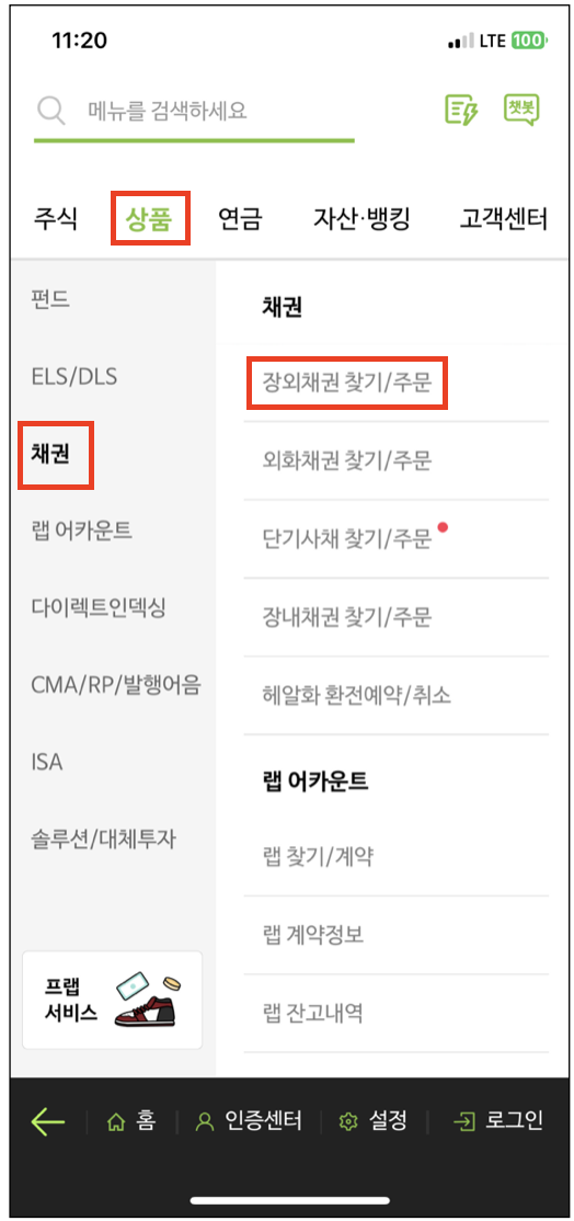 위와 같은 화면이 보이면 [상품]을 누른 뒤 [채권]으로 들어가 [장외채권 찾기/주문]을 누릅니다.