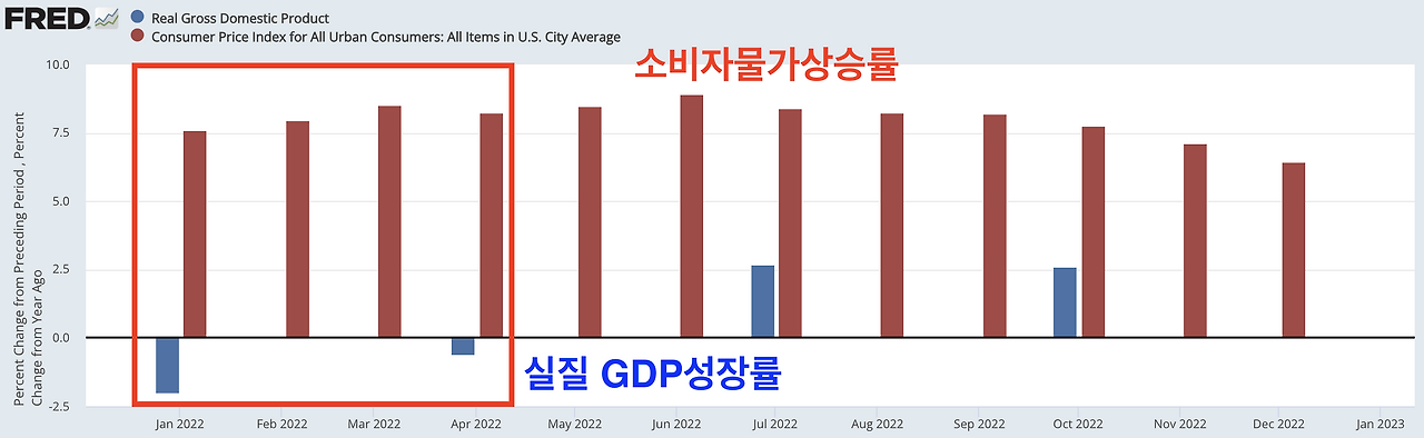 실제로 2022년에는 미국의 실질 GDP성장률이 두 개 분기 연속으로 마이너스가 났던 적이 있었습니다. 당시 소비자물가상승률은 7%를 상회하는 수준이었는데요, 그리고 3-4분기 때는 플러스 GDP성장률을 보였지만 그럼에도 물가와 차이가 매우 크게 났습니다.