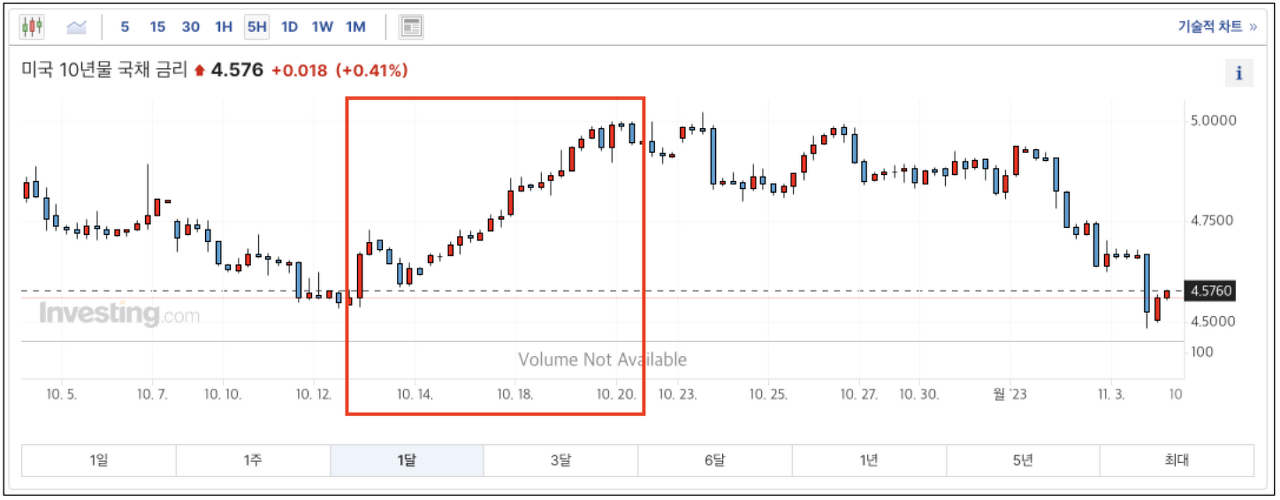 즉 당시 1천억 달러 규모의 채권 발행 검토를 요구한 것과 같은 것이죠. 이에 따라 채권발행 공급이 증가하게 되니 채권가격이 하락하게 될 것이고, 채권가격 하락이 진행되면 채권금리가 오르게 되는 현상이 나타나게 됩니다. 그로 인해 10월 중순 채권금리가 상승하게 되죠.