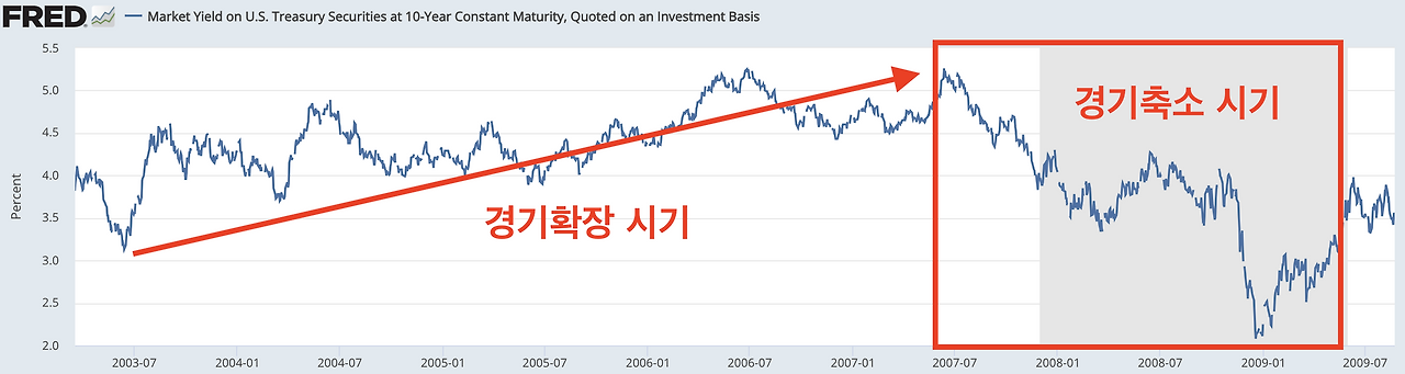 위 그래프는 미국의 장기금리를 보여주는 그래프입니다. 2003년부터 2007년 상반기 말까지 금리가 지속적으로 상승하고 있는데요, 장기금리의 상승은 경기확장 시기를 뜻합니다. 왜그럴까요?