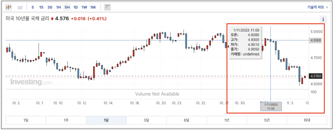 그리고 10월 말에서 11월 초 쯤에 미재무부의 4분기 국채발행 규모가 확정되었는데요, 당시 당초 예상되었던 규모보다 적게 발행한다는 소식이 들려왔습니다. 즉 채권공급 발행이 줄어든 것이죠. 공급이 줄어들면 가격이 증가하게 되니 당시 채권금리가 하락하게 되는 현상이 나타났습니다.