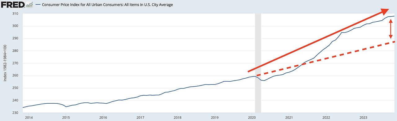 하지만 2020년 이후 물가상승 속도가 굉장히 가팔라진 걸 알 수 있습니다. 이는 코로나 위기 이후 정부와 연준이 유동성을 매우 크게 공급하고, 코로나와 전쟁 등과 같은 이슈로 공급망이 막혀버린 문제 등으로 물가가 매우 빠르게 올랐습니다.