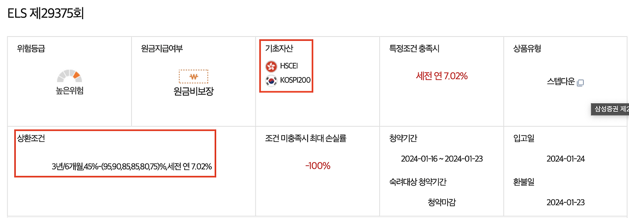 일단 다른 거 보지 않고 상환조건을 먼저 보면, [3년/6개월,45%-(95,90,85,85,80,75)%,세전 연 7.02%] 이렇게 적혀 있는 걸 확인할 수 있습니다.