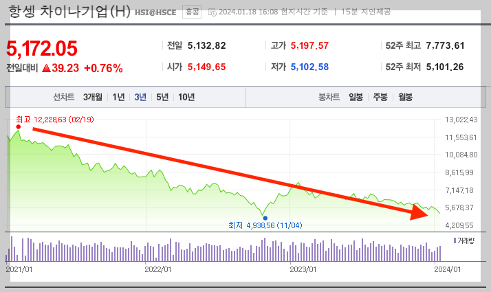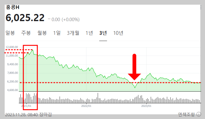 2021년 상반기 당시에는 중국뿐만 아니라 한국, 미국 등 글로벌 경제가 매우 좋았고 대부분의 자산가격이 다 오르던 시기였습니다. 그럼 당연히 그때의 증시 배경으로 본다면 홍콩지수가 반토막날 가능성이 없어 보였을 겁니다.